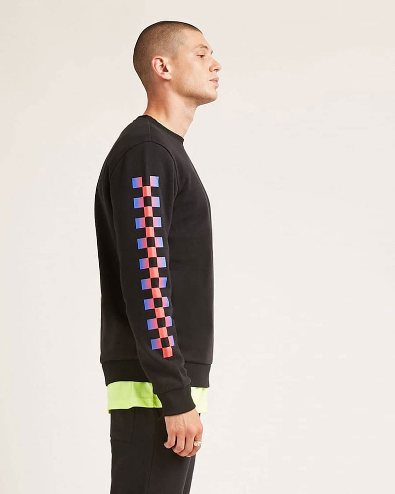 Accelerate your style with the R1 Checkered Sleeve Sweatshirt. This black crewneck takes a high-energy detour with vibrant, neon-gradient checkered graphics running down the sleeves. It’s the perfect statement piece for those who mix comfort with bold, athletic aesthetics.